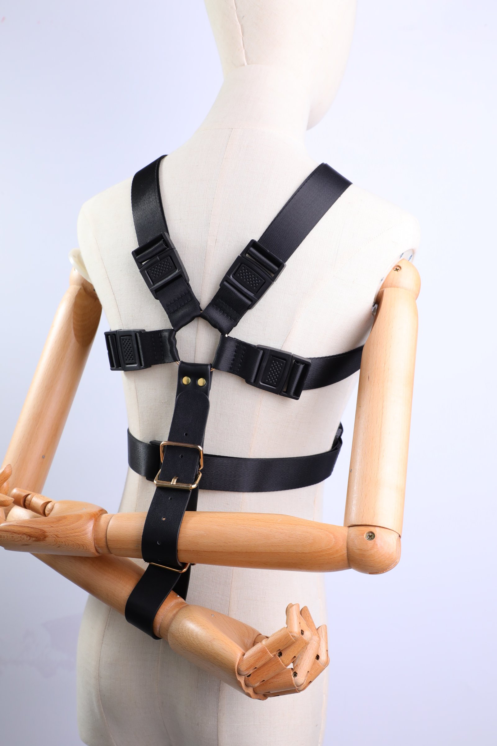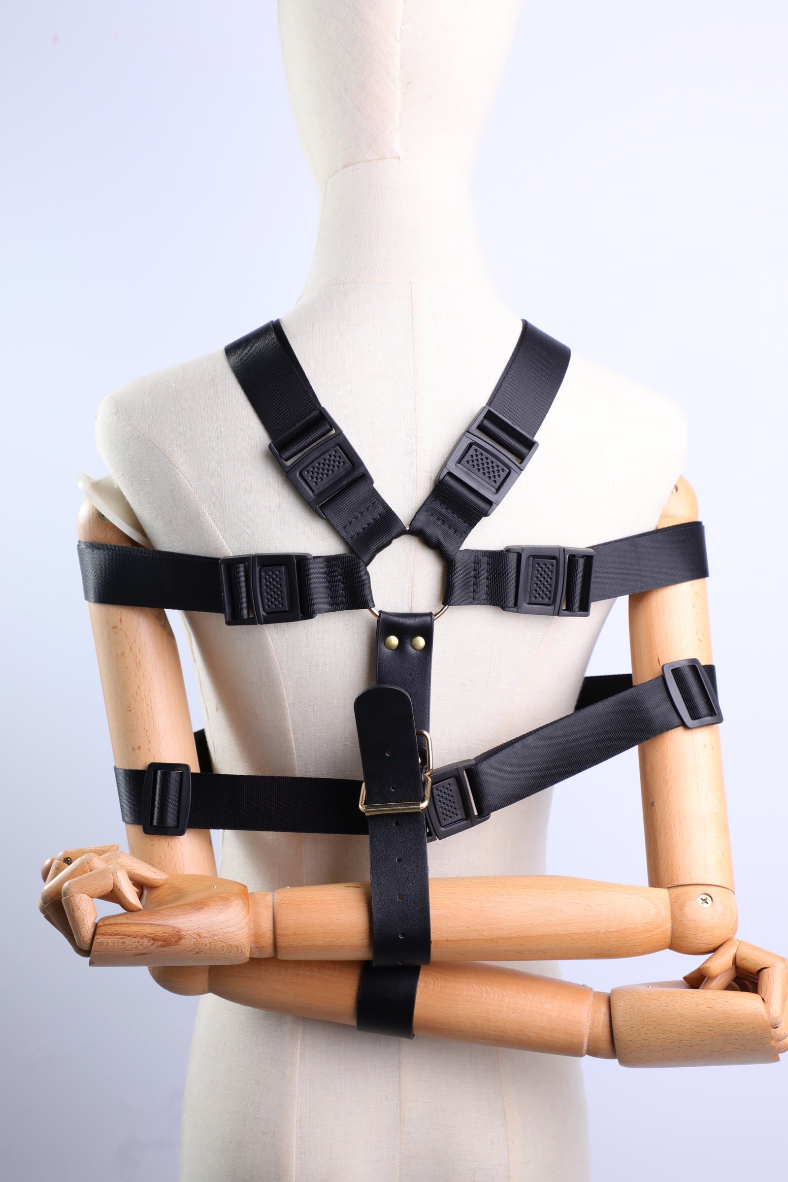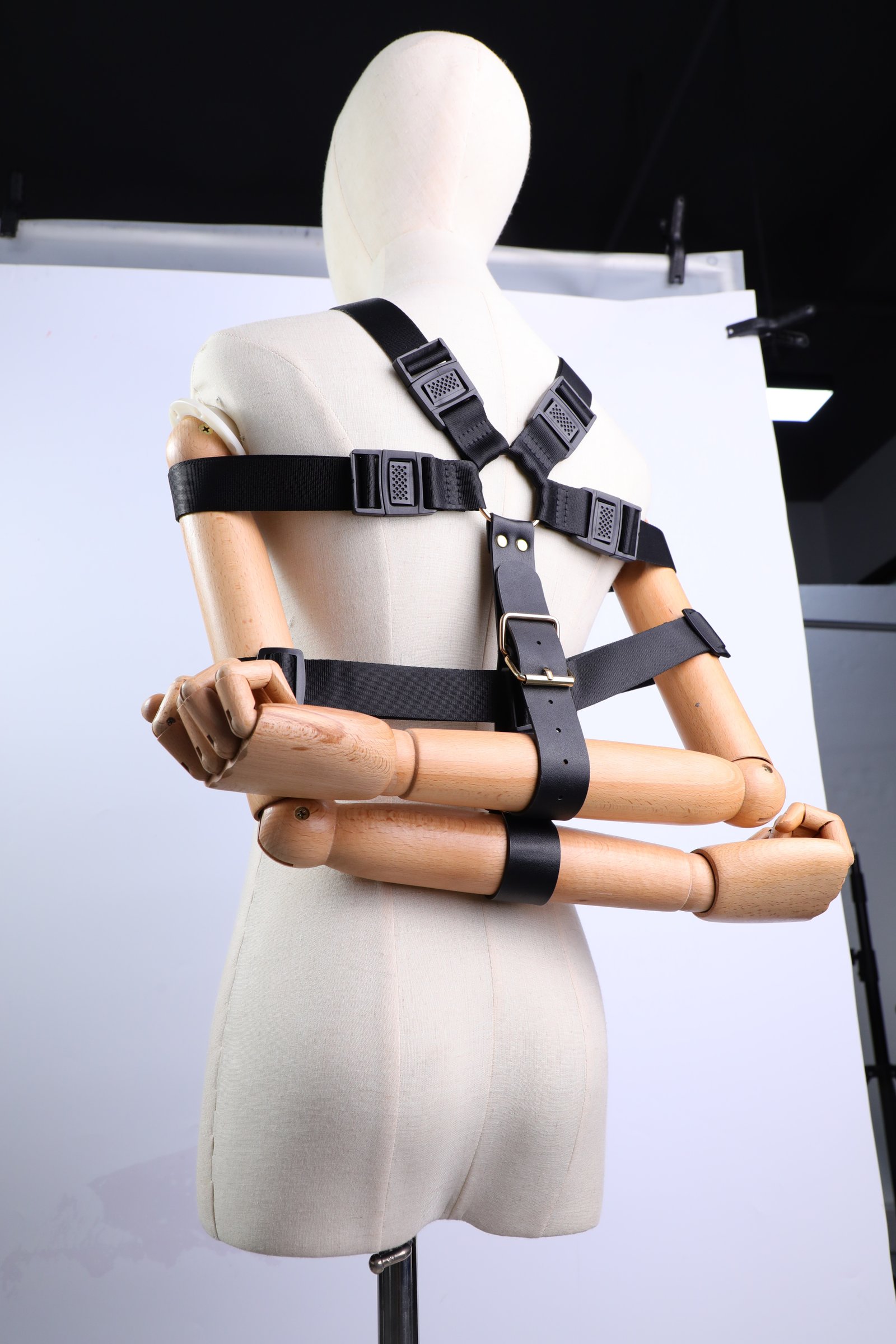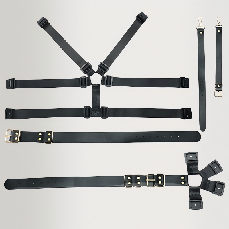 Size: The shoulder strap is adjustable from 36cm to 43cm, the upper chest strap from 95cm to 102cm, the lower chest strap from 75cm to 103cm, the handcuffs from 25cm to 38cm, the foot straps from 37cm to 51cm, and the link strap from 54cm to 65cm