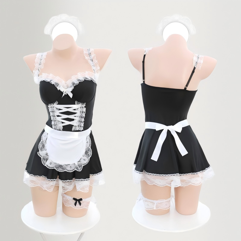 Dark-themed tulle jumpsuit with cut-out design, a dangerous yet charming vampire aesthetic! Sexy collarbone chain + leg ring A ruffled apron and a high-waisted lace mini skirt create a pure and sensual maid aesthetic! The bow neckpiece and the cut-out lace complement each other, balancing cuteness and ingenuity. Party/theme shooting magic tool, fulfilling all your fantasies about a gentle butler ~