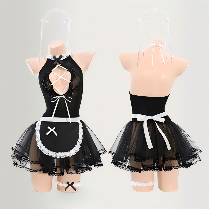 The design features a patchwork of tear-off chiffon and lace, with a heart-shaped off-the-shoulder cut and crossed lines, creating a pure and interwoven look. The matching cat-ear hairband not only retains the maid’s cute appearance but also features a surprising design that can be torn easily.