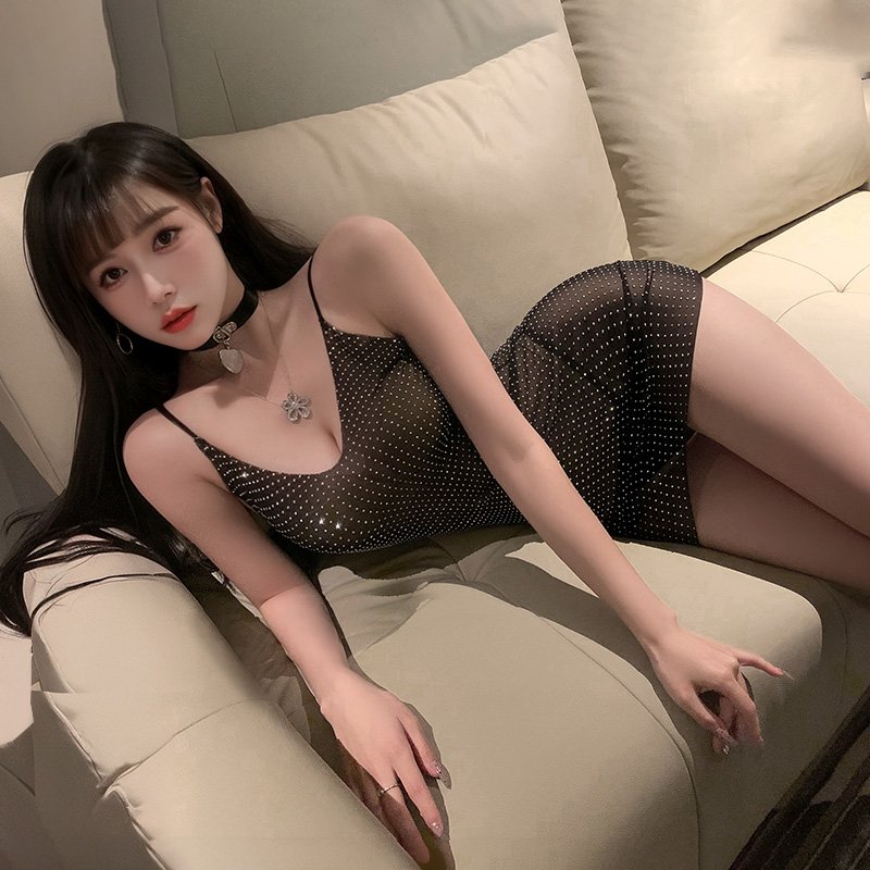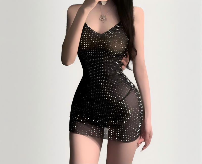 The sexy deep V-neck, with three-dimensional hot diamonds outlining alluring lines. The transparent mesh fabric is spliced together, and the graceful figure is faintly visible. The figure-hugging and body-hugging cut perfectly showcases the curves of the waist and hips. At a night party or a date dinner, make yourself the most dazzling presence.