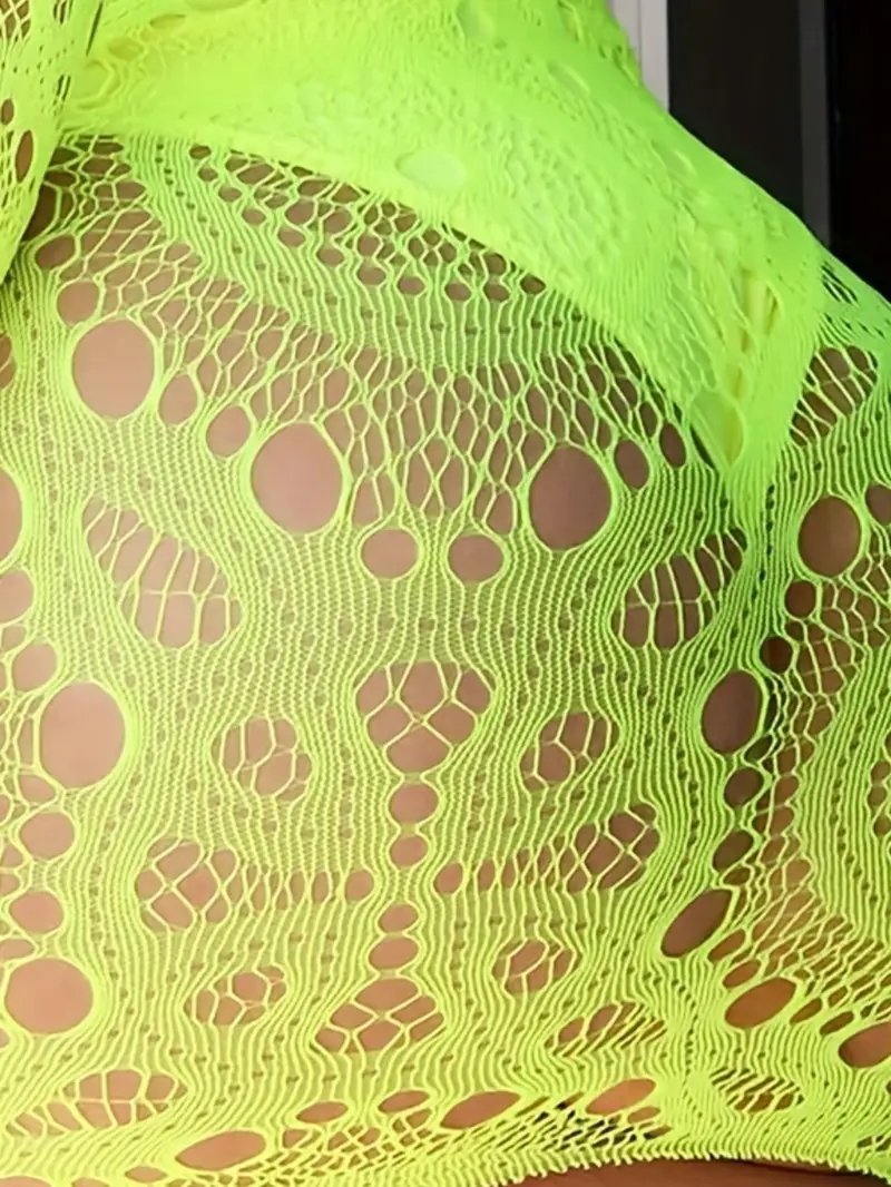 The suit integrates a fishnet see-through design, and the sexy body-hugging skirt accentuates the buttocks, complemented by cut-out details. The light and transparent mesh fabric is faintly visible, combining the style of a uniform with the comfort of pajamas, effortlessly capturing the fatal allure of private moments.