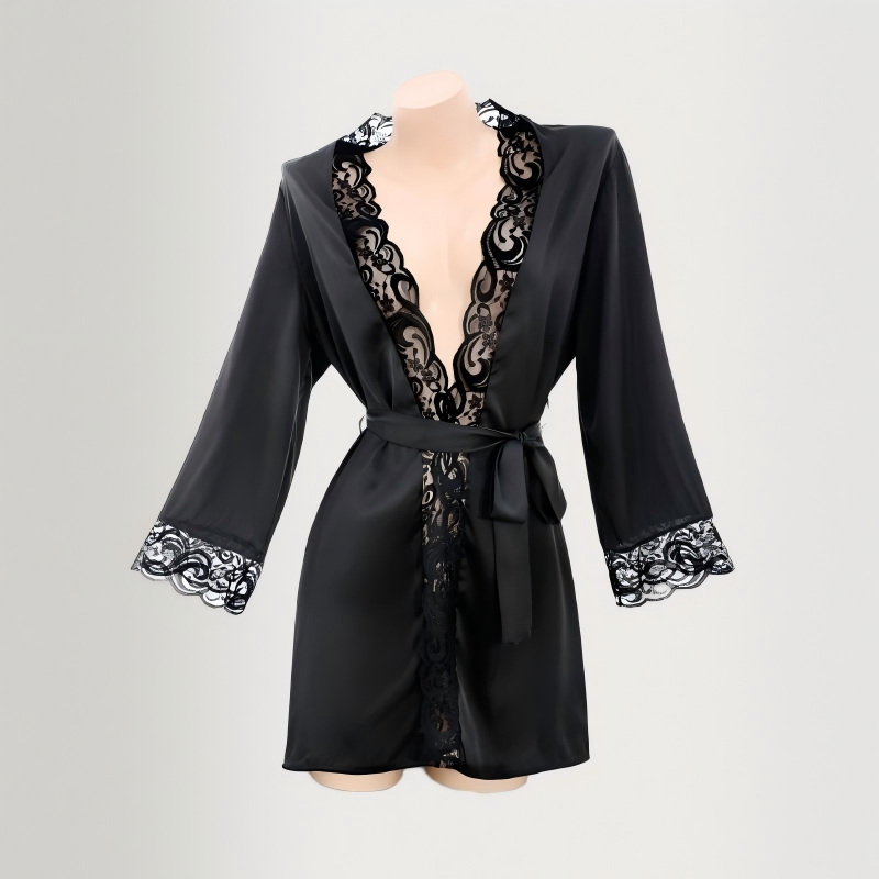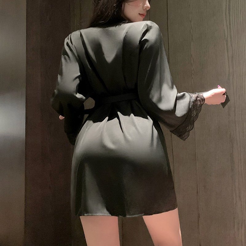 Luxurious satin material, with a silky smooth touch that is skin-friendly and drape smoothly. The lace trim Outlines the neckline and sleeve hem, faintly visible and adding a touch of sexiness. The lace-up waist-cinching design showcases a graceful curve. Loose mid-length cut, combining laziness and charm. Whether at home in the morning or in private moments at night, it exudes an elegant and alluring charm.