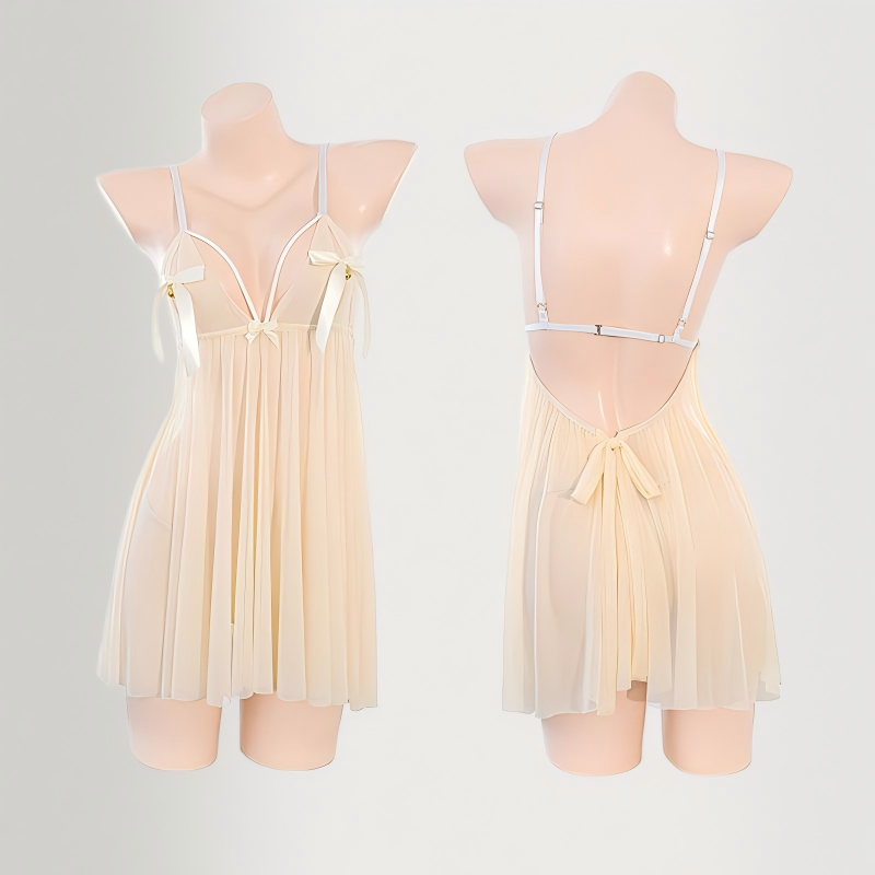 The alluring gauze seeps through the snow-white skin, the straps wrap around the graceful curves, and every step is accompanied by the soft jingle of bells. The deep V-shaped support shows fullness, with a faint and fatal attraction. The high slit skirt sways gracefully, making the night intoxicated and wild for you.