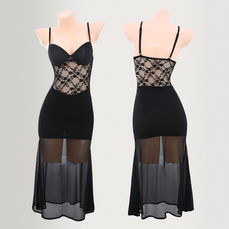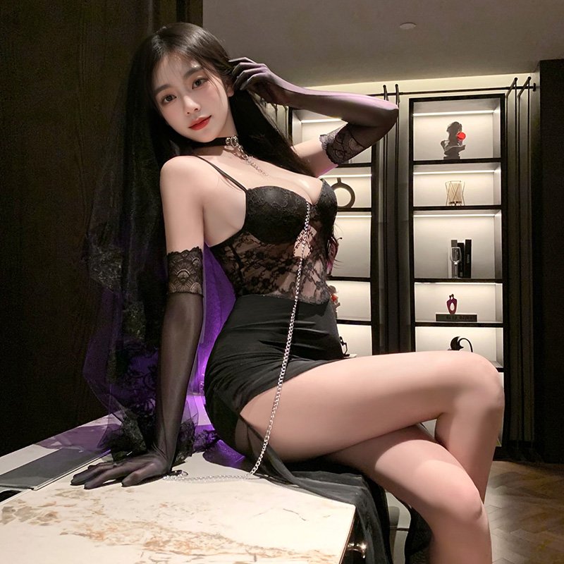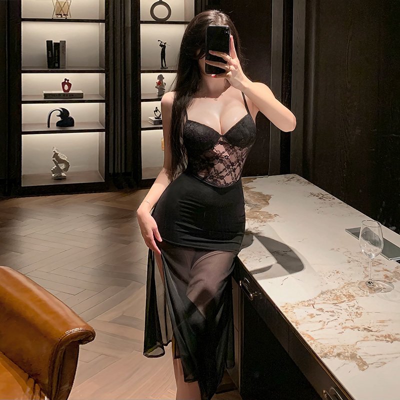 The three-dimensional cut fishtail skirt sways gracefully, and the built-in memory foam chest pad highlights the full curves, exuding an irresistible allure in the dark night. The deep V-neck is paired with a cross-lacing strap at the back. The velvet fabric feels like a kiss, highlighting a seductive figure as you walk. The silk outer robe gently wraps around the jade body. The suit design extends from the bedroom to the living room, leaving no place for his eyes to escape.