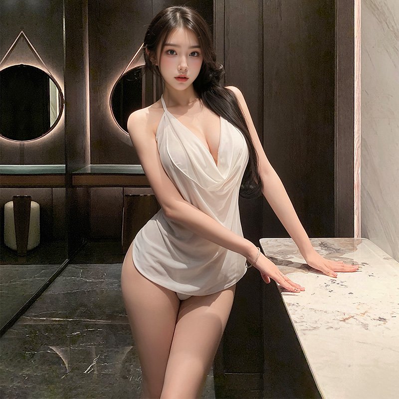 The collar is designed with a drawstring that can be adjusted to create a swan-like neck. The bellyband style front piece is paired with a backless strap, creating a sensual blend of classic and modern elements. Her beautiful legs are faintly visible as she moves. The silk fabric fits the skin closely, exuding the subtle allure of the East from the boudoir to private dates.