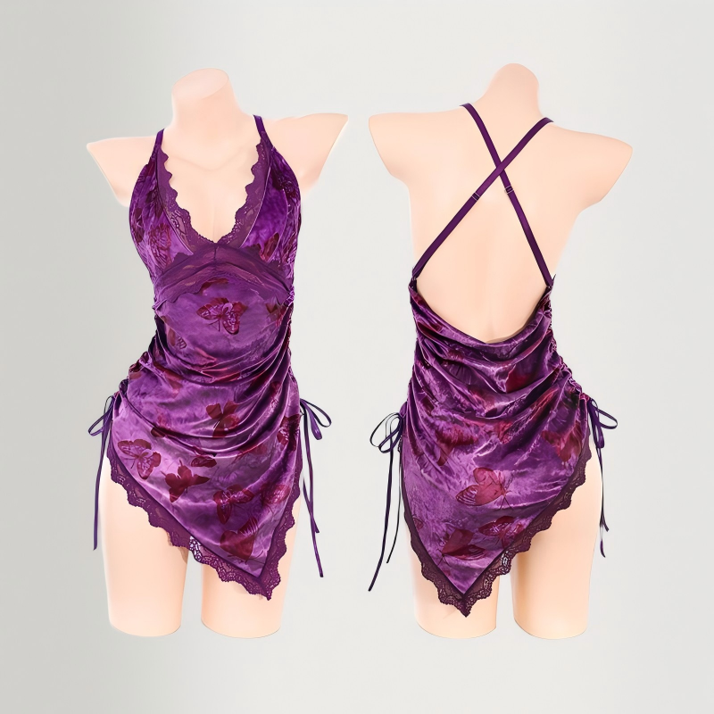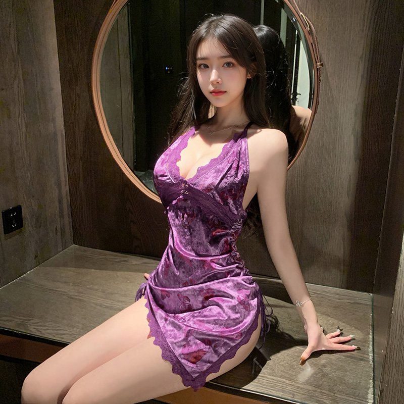 Luxurious velvet Outlines a seductive figure, with a deep V-neck extending to the bare back of the lower waist, offering a double allure and a fatal strike. The retro dark print spreads across the skirt hem. The adjustable neck strap and cinched waist cut transform the laid-back pajamas into midnight battle robes. Tonight, you are his unsolvable puzzle.