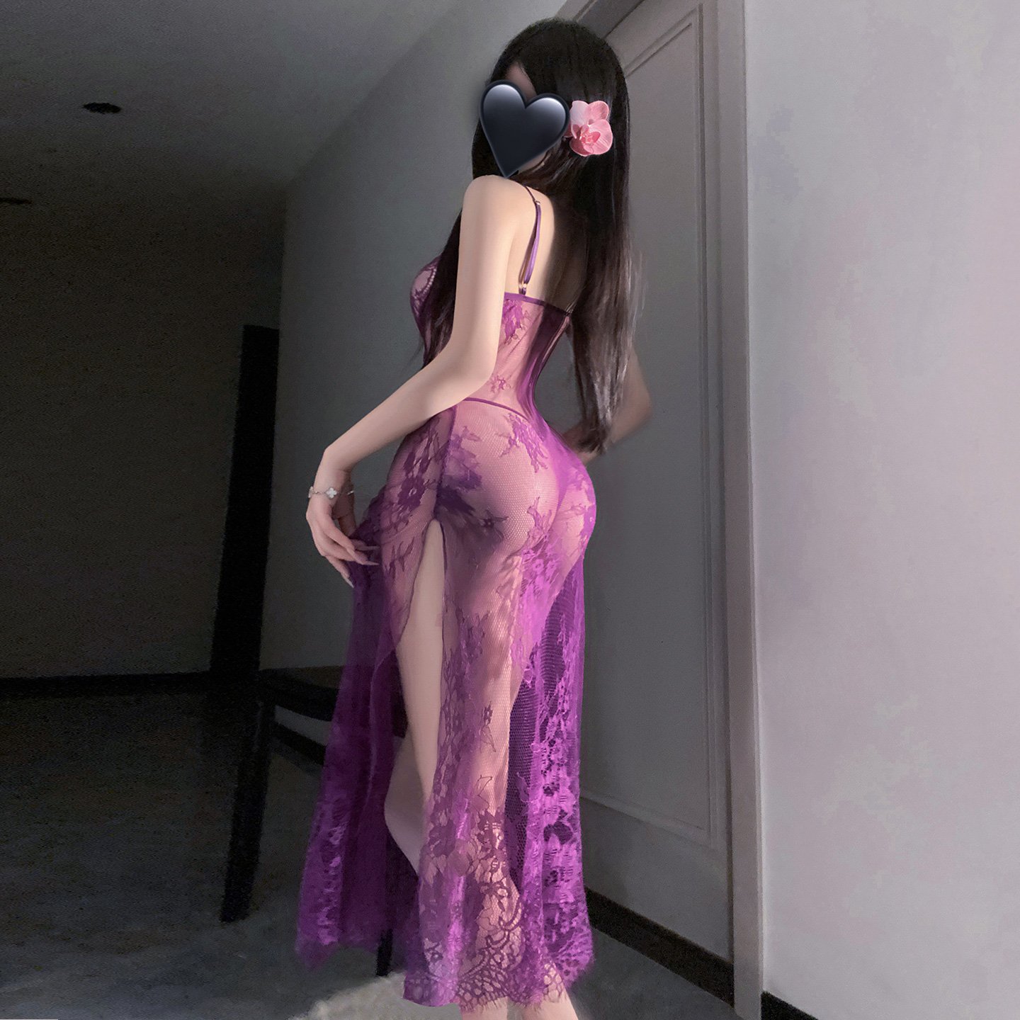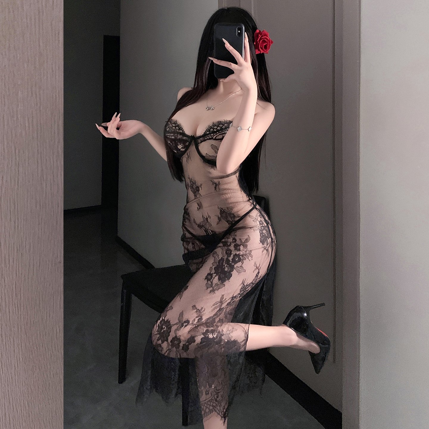 The antique lace is superimposed, and the skin-penetrating dark patterns bloom with rose totems on the waist and hips. The deep V-neck neckline hangs down a pearl pendant chain that wanders through the crevices with each breath. The high slit design makes the lace sock strap faintly visible. The back waist is hollowed out and tied with spider web lace. When turning around, the snow back and the black satin ribbon interweave into a trap of playing hard to get. Under the night banquet lights, every inch of lace reflected a hormonal glow.