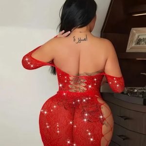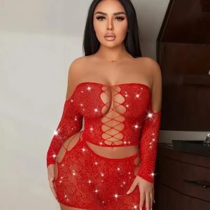 A strapless net top and high-waisted short skirt set, decorated with rhinestones and stars, shining with a girlish charm. Jacquard lace spliced with sheer mesh fabric, and the hollowed-out waistline conceals a little trick. The A-line skirt hem accentuates the proportion of the buttocks and legs. It’s A perfect match for dates or parties, with a pure and stylish collision that shines with charm